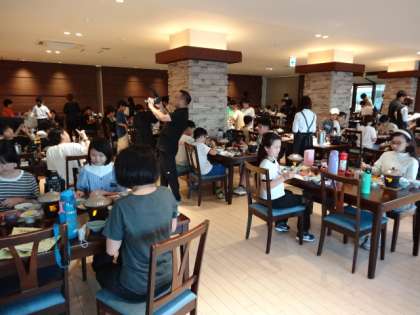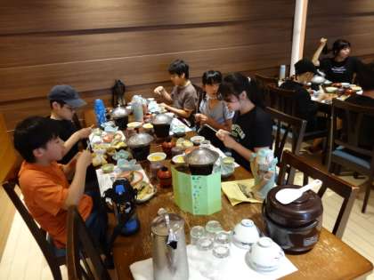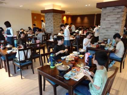 今日は日中いっぱい活動をしたので、お腹もペコペコです。お刺身やてんぷら…。和歌山の海の幸もいっぱいのおいしい夕食です。ご飯を何杯もおかわりする子もいました。この後は、予定通り入浴をして、レクリエーションの時間となります。