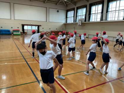 体育科では、「鉄棒運動」の学習と並行で、「フォークダンス」の学習をしました。「コロブチカ」という踊りを、ペアで楽しく踊ります。はじめはいろいろなふりに戸惑っているようでしたが、すぐに覚え、何度も楽しく踊っていました。