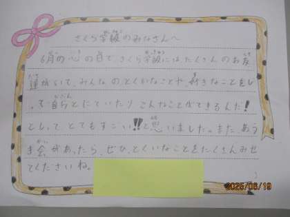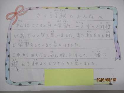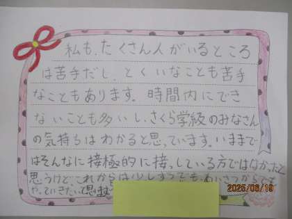 5月のこころの日の学習では、さくら学級の友だちのことについて学習をしました。「好きなことが自分と同じだな。」「もっと話をして、自分のことも知ってもらいたいな。」「一人一人のペースに合わせて学習をしているんだな。」と、さくら学級の友だちのことを知り、相手の立場に立つことや、共に生きる大切さについて考えることができました。