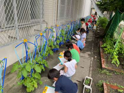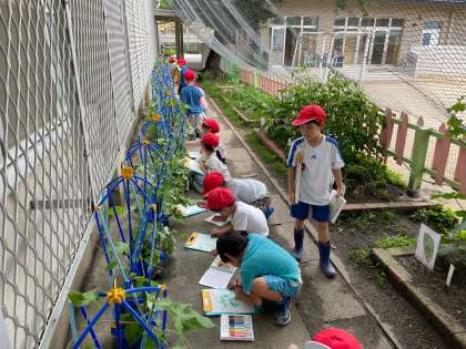 生活科の学習で、アサガオの観察を行いました。もう花が咲いている人や、つぼみがあり、あと少しで花が咲きそうな人、ツルがとても長くまで伸びている人などがおり、いろんなアサガオを観察しました。