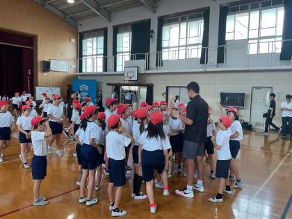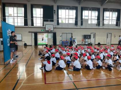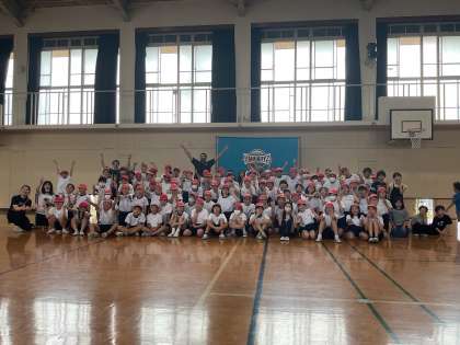 実際の選手の身長の大きさに驚いていた子どもたち。活動の中でも大盛り上がりで、バスケットボール教室を楽しむことができました。2学期には体育でも「バスケットボール」を学習します。その時にいかせるといいですね☆
