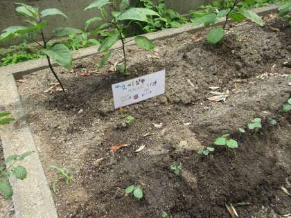 オクラは種から元気に芽を出し、キュウリやナス、サツマイモは葉が増え、背が高くなっていました。