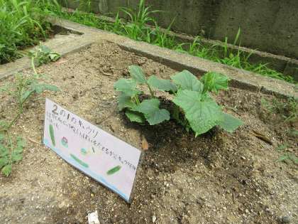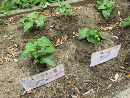 学校の2年生の花壇に植えたキュウリ・オクラ・ナス・サツマイモをみんなで観察しに行きました。
