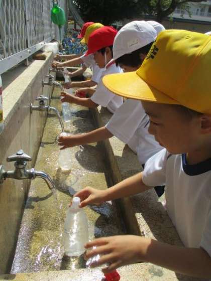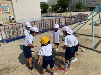 生活科の「なつとともだち」の単元で水遊びをしました。マヨネーズやケチャップの容器に水を入れて、水を飛ばしたりお絵描きしたりと、みんなとても楽しそうに活動をしていました。空き容器のご準備、ありがとうございました。