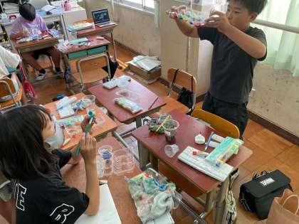 図画工作科では、「水から発見!ここきれい」の学習に取り組みました。色水をいろいろな容器に入れ、「きれい」を見つけました。また、スポイトや水をはじく素材を使って、水滴を作る出す児童もいました。