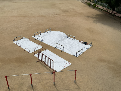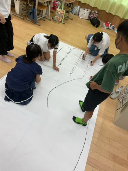 描いた大仏の顔と手を運動場に並べると、「でっか!」「人の大きさの4人分や!」など大仏のサイズを感じるとともに、当時つくった人の思いなどを考えることもできました。