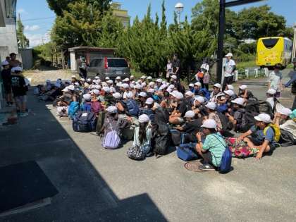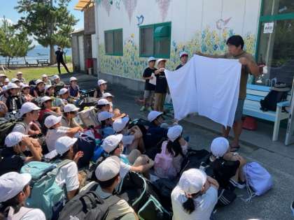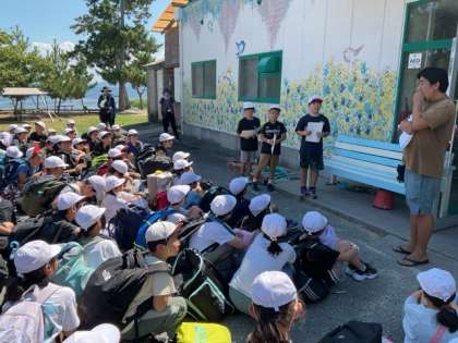 予定時刻より少し早くびわ湖青少年の家に到着しました。入所式を済ませたら、「ザリガニ釣り」「カヌー」「浜遊び」です!