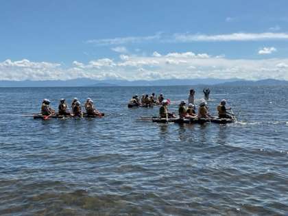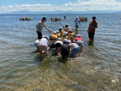 完成したいかだを琵琶湖に移して、みんな無事に乗っています!