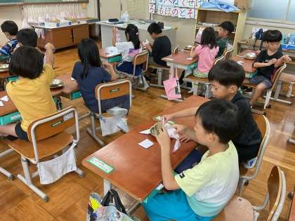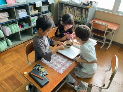 子どもたちが一生懸命にお世話をして大切に育ててきたあさがおの花を使って、色水遊びをしました。あさがおの花を絞って色水ができたときは、とてもうれしそうな表情でした。作った色水を使って半紙を染め、素敵な模様を作ることができました。