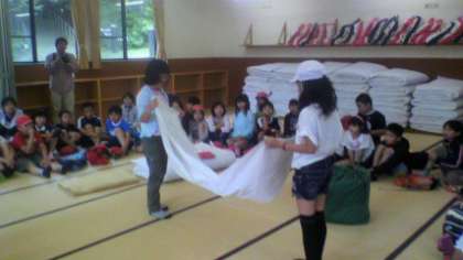みさきの家に着き,まずは入所式。そしてオリエンテーリングがありました。シーツの式方たたみ方などを教えてもらいました。さぁ、いよいよみさきの家での活動が始まります。