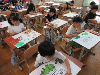 絵本の読み聞かせを聞いて、お話から想像したことを絵で表現しています。