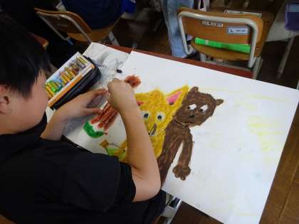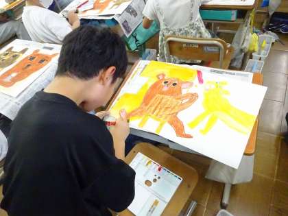 図工「言葉から感じて」の学習では、物語から場面を選び、下描きをもとに想像したことに合う形や色を考えて、工夫して表しました。