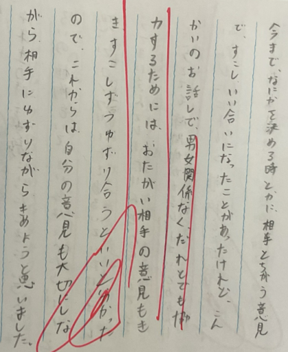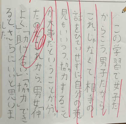 今月の「こころの日」の学習では、ジェンダー平等について、『古いバケツ』というお話を通して考えました。性別に関係なく、お互いの気持ちをきちんと理解し合うことや、相手の立場になって考えること、そして話し合いを通じて協力することの大切さを学びました。互いを尊重し合うことが、よりよい関係づくりにつながることを考えることができました。