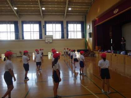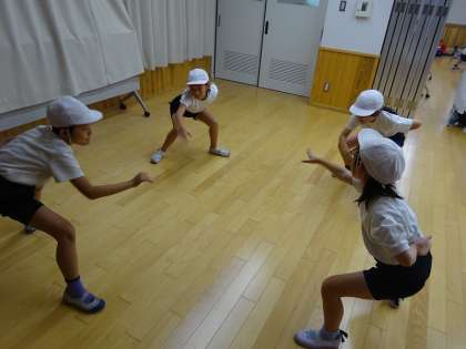 スポーツ大会に向けた団体演技の練習も、隊形移動の練習を始めました。列ごとに演技をずらす場面もあり、一人一人が自分の場所で音楽をよく聴いて、演技ができるように練習をしています。互いの演技にアドバイスをし合って、高め合おうとする姿も見られます。