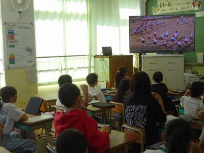 団体演技の練習後には、動画で振り返り、よりよい演技にするためにどのようなことを大切としていくとよいのかを交流しました。