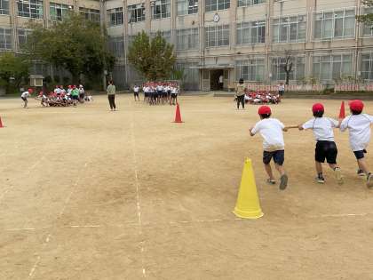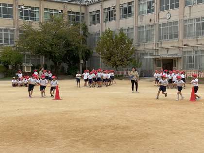 スポーツ大会にむけて、練習をしています。3年生は、「台風の目」という競技に取り組みます。「誰がどのポジションにいく?」「ジャンプしなきゃ!みんな、気をつけて!」と、声をかけ合い、一生懸命に練習しています。