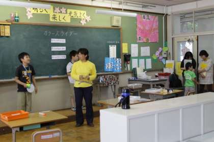 6年生,5年生,1年生の3人の子どもたちはカラースライダーというおもちゃを作り,遠くまでスライダーをとばそうとがんばっていました。