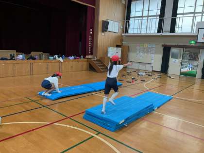 体育科では、「マット運動」の学習を始めました。まずは、体慣らしの仕方を確認しました。「ゆりかご」「かえるの足打ち」など、主運動につながる運動をします。その後、まずは今できる技・できない技を調べました。早速協力して学習に取り組んでいます☆