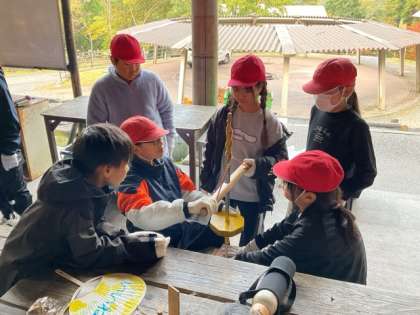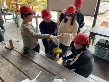 野外炊事には火が必要。その火を自分たちで準備します。まい切り式の火起こしに、みんな真剣な表情で挑戦しました。