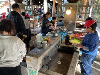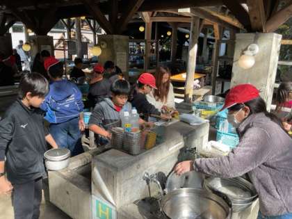 今日は待ちに待った野外炊事。班ごとに火を起こし、協力して準備を進めています。