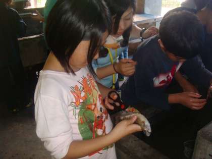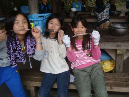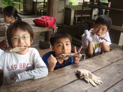 午前中に捕った魚を焼き食べました。魚をさばくことからはじめました。最初はなかなか作業が進みませんでしたが,全員しっかりと魚をさばくことができました。魚(イワナ)に串を刺し塩を振って炭でじっくり焼きました。「なんかかわいそう」といっている子どももいましたが,「おいしい!」と喜んで食べていました。命をいただくことの意味をしっかり捉えてくれたことと思います。