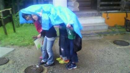 雨が降っています。合同振り返りを炊飯場で行ったので,グループごとに「レインオリエンテーリング」をしながら本館に戻ってきました。雨でも十分に楽しく過ごしました。