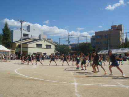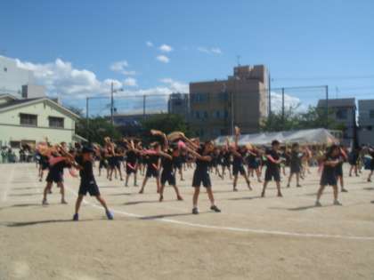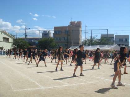 3・4年生の団体演技 ダンス「京の舞」は大変勇ましく,格好良い姿でした。楽器「四つ竹」の音も良く,黒い服もダンスにぴったりでした。「丸竹夷二・・・」の京都の通りの歌や「ハッ!」という声は大変大きく,運動場に響いていました。