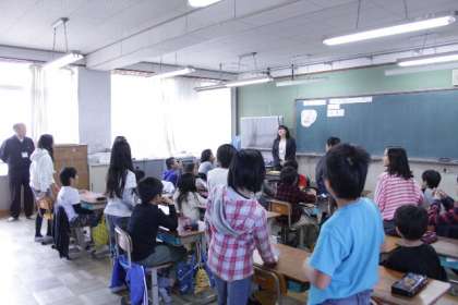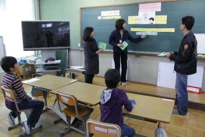 4年生では外国人教育をテーマに、他の国の文化のよさをみとめ互いに尊重しようとする心を育てようと「日本ととなりの国」という道徳の授業を行いました。
