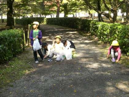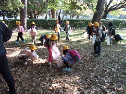 京都御所は日なたは暖かく、日陰は少し肌寒かったですが、子どもたちは下に落ちている「秋」を一生懸命に探していました。
