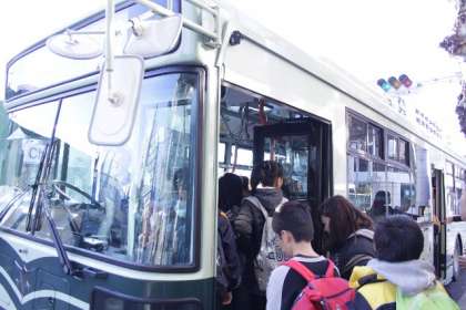 西大路花屋町のバス停から5年生がスチューデントシティへ向けて出発しました。