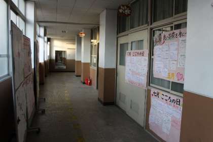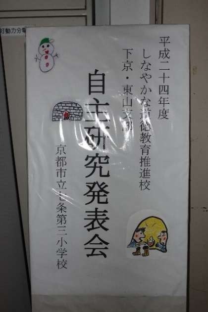 写真は研究発表会の看板とPTA室の前の廊下、会議室の様子です。