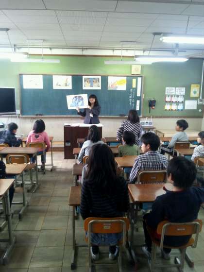 子どもたちは黒板に提示された絵を見ながら自分の考えをのべていました。