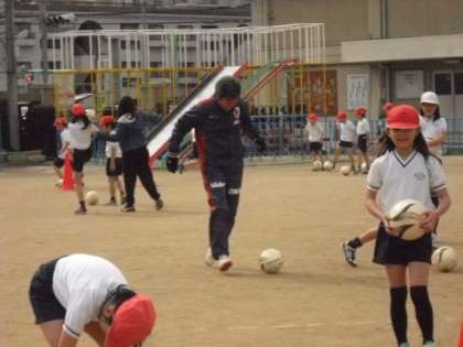 京都サンガつながり隊のコーチが来てくださり,サッカー教室がありました。ボールをけるだけでなく,様々なゲームを行いながら,話を聞くことの大切さ,運動することの楽しさ,仲間と協力することの大切さなどを教えてくださいました。子どもたちは歓声を上げながら笑顔いっぱいで楽しんでいました。子どもたちは「サッカーを通して他の人とのつながりを深めてくれてありがとうございました。」「コーチに出会えて嬉しかったです。」「もうちょっと大人になろうと思いました。」