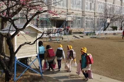 玄関の梅の花もだいぶ咲いてきました。写真は登校の様子です。