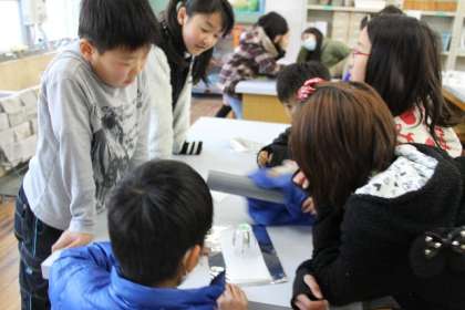 「静電気でも物が動く。」と子どもたちは喜んで、塩化ビニール管をこすって静電気をおこしていました。
