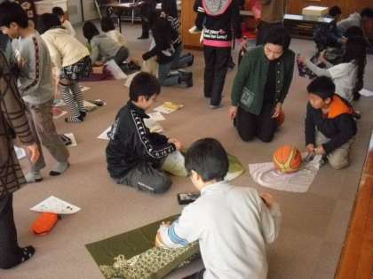 「(バスケットボールを見せて)冬になるとスイカはこんなふうになります。」との説明に子どもたちは、バスケットボールを包んで「スイカはいらんかねぇ。」とたのしそうでした。
