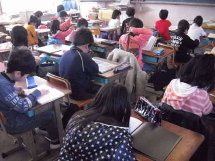 みんなで音読をするのではなく、先生が範読をして、間違えたところで子どもたちは起立して正しく読みかえる音読をしていました。