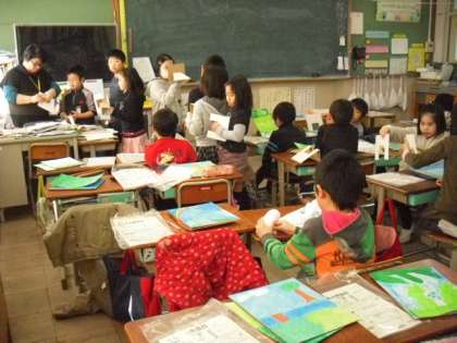 2年生は体育館に図工展の作品を展示した後、教室に戻って静かに読書をしていました。