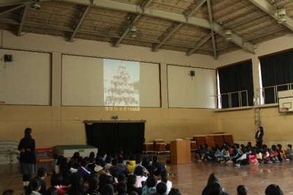 2枚目の写真は体育館の後ろに運動会で5・6年生で作ったピラミッドが映し出されている様子