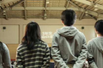 3枚目の写真は歌っている6年生の子どもの後ろから、映し出されている説明(このあと5年生で行った山の家での写真がありました)を撮影しました。