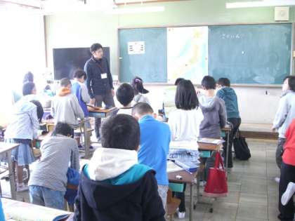 社会では地図帳を使って日本の地名を索引から見つけて探す学習をしていました。「△△県はどこでしょう。」「○ページのJ。みつけた。」と地図の学習をしていました。
