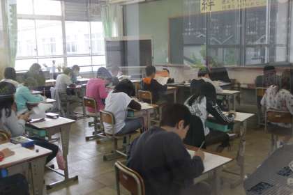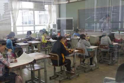 どちらのクラスも真剣そのものでした。というわけで教室に入って撮影すると子どもたちの意識が乱れる恐れがありましたので、廊下から扉越しに撮影しました。