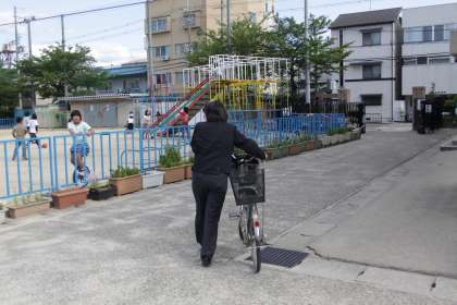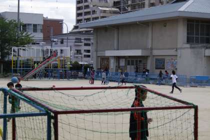 子どもたちは運動場で仲良く遊ぶ中,担任は「いってきます。」と挨拶して出発していきました。