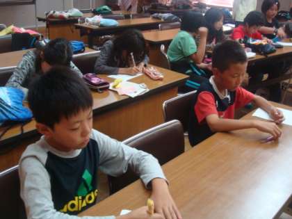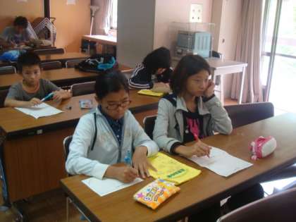 その後,西大路小学校と合同の振り返りをしました。一緒にした竹箸づくり,カレー作り,登山,キャンプファイヤーなど,楽しかったことを書き,発表し合いました。子どもたちは本当に仲良くなり,良い友だちができたと喜んでいました。