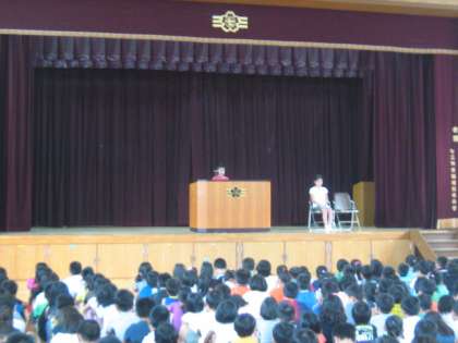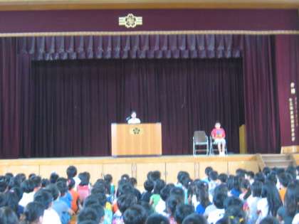 朝会では5年生が山の家での魚さばきについて感動体験を話してくれました。