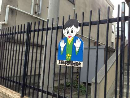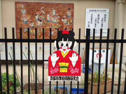 学校の校門と学校前の柵に「とびだしぼうや」という木でつくったかわいらしい看板ができました。着物を着て,京都らしいとても愛嬌のある看板です。この看板を見て「飛び出し注意」「走ると危険」と自分にストップをかけてほしいと思います。