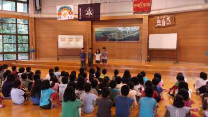 みさきの家2日目。美しい朝の風景です。大変良いお天気で,今日は暑くなりそうです。6時に起床し,朝の準備をしました。少し眠たそうな子どもがいますが,みんな元気です。プレイホールに集合し,朝の集いをしました。校歌を歌い学校紹介をしました。そして朝食です。