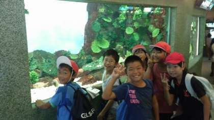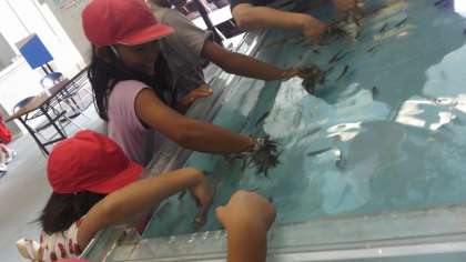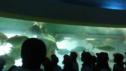 志摩マリンランドでドクターフィッシュ,海女さんの実演で大はしゃぎの子どもたち。とても楽しい見学でした。昼からは,ペンギンタッチや裏方体験をさせてもらいました。