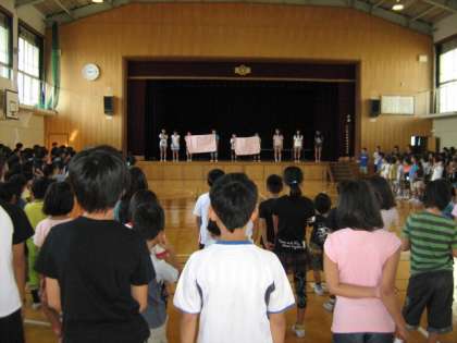 音楽委員会の子ども達がその練習をしようと、舞台で歌詞カードを広げて音楽に合わせて合唱しました。