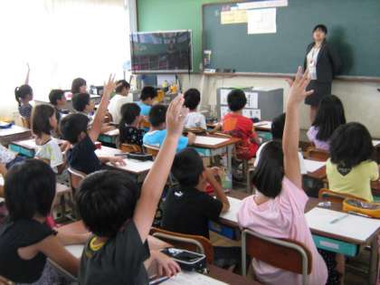 みんなが手を挙げて自分の考えを発表しようとしています。